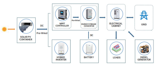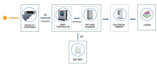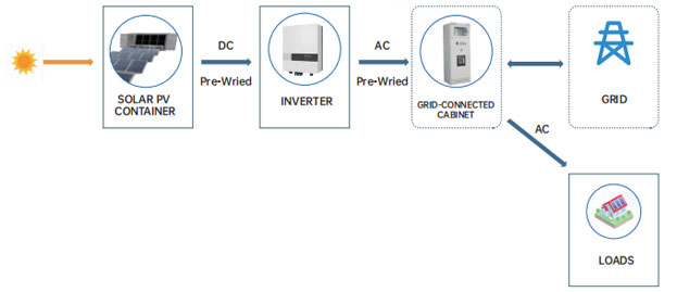 A szolármodul által generált egyenáramot az inverter váltakozó árammá alakítja, amelyet ezután a terhelésre táplál, és a hálózatra kapcsol. Ily módon a háztartási terhelés kielégítése mellett a felesleges villamos energia is értékesíthető a hálózatba.